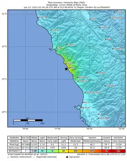 The 2021 Mala earthquake, with a Richter magnitude of 6.0 and moment magnitude of 5.9, struck on June 22, 2021, at 21:54:18 local time (UTC-5) with an epicenter off the coast of Mala in the department of Lima.[6][7] Following the main event, there were more than 15 aftershocks, with the largest being a magnitude 4.8 event at 07:03 local time on June 23.