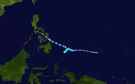On May 11, the JTWC noted a persistent area of convection in the Philippine Sea, approximately 184 nmi (341 km) west of Palau.[59] The JTWC issued a TCFA for the convection on May 12, as it further developed in an environment with low vertical wind shear and warm sea surface temperatures.[60] Just three hours later, the agency recognised that the area of convection had quickly consolidated into a tropical depression and assigned it with the identifier of 03W.[61] Around the same time, the JMA had also recognised the storm as a tropical depression while it was to the east of Mindanao.[62] Since the storm developed within the Philippine Area of Responsibility, the PAGASA immediately named the storm Crising once the agency recognized it as a tropical depression as well, and later raised Signal No. 2 warnings for areas in Mindanao.[63][64] In the early hours of May 13, the JTWC upgraded the system into a tropical storm, with the PAGASA following suit hours later.[65][66] Later that day, Crising's low-level circulation center became exposed due to wind shear, and it lost organization. At 8:20 p.m. Philippine Standard Time (12:20 UTC), Crising made landfall in Baganga, Davao Oriental as a weakening tropical storm. It quickly degraded as soon as it made landfall, with both the JTWC and the PAGASA downgrading it to a tropical depression at 15:00 UTC.[67][68] At 03:00 UTC on that day, the PAGASA reported that the system degenerated to an area of low-pressure in the vicinity of Piagapo in Lanao del Sur, thus lifting all warning signals on Mindanao and issuing their final advisory.[69] On May 14, the system dissipated over the Sulu Sea, and both the JMA and the JTWC issued their final advisories on the storm.
