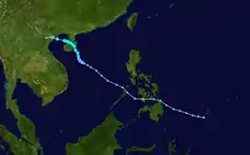 At 12:00 UTC on July 3, the PAGASA started to monitor a low-pressure area that developed near Torrijos, Marinduque or 149 kilometers to the south of Manila, followed by the Joint Typhoon Warning Center (JTWC)'s advisory at 01:00 UTC on the next day, citing the system's development as "low".[150][151] In the latter's analysis on the disturbance, multispectral and microwave image scans on the system showed a weak low-level circulation center over the eastern part of Mindoro with flaring convection in the western periphery.[151] Traveling northwestwards, the storm was located in an environment conductive for further intensification, with warm sea surface temperatures of 30–31 °C (86–88 °F), low wind shear around the region and good equatorial outflow; however, model forecasts were split regarding the disturbance's strengthening trend.[151][152] Also that day at 15:00 UTC, the low-pressure area exited the Philippine Area of Responsibility (PAR), which was followed by the Japan Meteorological Agency (JMA) upgrading the storm to a tropical depression roughly three hours later.[153][154] Eventually, the JTWC upgraded the system's potential intensification trend to "high" and subsequently issued a Tropical Cyclone Formation Alert at 00:30 UTC on June 6 as a circulation became well-defined.[155] It then changed its motion towards the west along the periphery of a subtropical ridge on the north and northwest as it approached the Hainan Island.[156] By 06:00 UTC on the next day, the disturbance moved inland on the region near Lingshui Li Autonomous County before emerging on the Gulf of Tonkin, in an area of low to moderate wind shear.[157][158][159] Later, the disturbance began to reorganize; however, strong wind gradient suppressed its intensification, with flaring convection displaced to the west.[158] Nine hours later, the JTWC upgraded the system to a weak tropical depression with maximum sustained winds of 45 km/h (30 mph); the JMA analysed the storm to be at 55 km/h (35 mph) and a minimum barometric pressure of 1000 hPa (29.53 inHg).[160][161][162] By the night of that day, the depression, with the identifier 08W from the JTWC made landfall on Thanh Hoa, Vietnam on that intensity, before subsequently issuing their final warning as the agency confirmed that the system dissipated inland, with the evidences of radar and satellite imagery.[163] The JMA continued to monitor the system until it dissipated at 00:00 UTC on July 8 over Laos.[164]