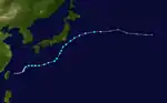 On May 27, the JMA and the JTWC noted the persistence of an area of atmospheric convection about 425 nautical miles (787 km; 489 mi) south-southeast of Guam.[74] The area's nearby environment exhibited low wind shear and warm sea surface temperatures, which were ideal conditions for tropical cyclogenesis.[75] The JMA assessed the area to have developed into a Tropical depression on May 29 at 06:00 UTC.[76] The PAGASA made a similar assessment in a Tropical Cyclone Advisory issued at 15:00 UTC.[77] The JTWC later followed with their own assessment, identifying the center of the newly developed tropical depression and assigning the designation 04W.[78] As the system tracked westward, it entered the Philippine Area of Responsibility at 01:00 PHT (17:00 UTC).[79] The PAGASA then named the storm Dante in its first Tropical Cyclone Bulletin for the storm.[80] Dante further organized in the Philippine Sea,[81] and on May 30 at 15:00 UTC, the JTWC upgraded it to a tropical storm,[82] with the PAGASA doing the same at 21:00 UTC.[83] On the next day at 00:00 UTC, the JMA also upgraded Dante into a tropical storm, giving it the international name Choi-wan.[84] Choi-wan's center was exposed due to a tropical upper tropospheric trough from the northeast, inducing shear on the system.[85] On June 1 at 12:30 UTC, Choi-wan made landfall on Sulat, Eastern Samar as a minimal tropical storm,[86] with the JTWC downgrading it to a tropical depression at 15:00 UTC.[87] It made a second landfall on Cataingan at 17:00 UTC.[88] Choi-wan made several more landfalls on the Philippines, making its third landfall on Balud, Masbate at 19:30 UTC. It made a fourth landfall on Romblon, Romblon on June 2 at 00:00 UTC, a fifth on San Agustin, Romblon at 00:50 UTC, a sixth on Pola, Oriental Mindoro at 06:00 UTC, a seventh on Tingloy, Batangas at 11:20 UTC, and an eighth and final landfall on the Calatagan Peninsula before moving into the South China Sea.[89] On June 3 at 03:00 UTC, the JTWC upgraded Choi-wan back to a tropical storm.[90] At 03:00 UTC, the PAGASA removed all Tropical Cyclone Warning Signals as Choi-wan moved away from the country.[91] Choi-wan then exited the PAR on June 3 at 18:00 UTC[92] before weakening into a tropical depression on the next day at 06:00 UTC and re-entering the PAR at 08:00 UTC.[93] Then, it passed southeast of the island of Taiwan[94] before moving out near the Okinawa Prefecture and heading towards Japan. On June 5 at 06:00 UTC, the Japan Meteorological Agency issued their final advisory on the system.[95] 3 hours later at 09:00 UTC, the JTWC upgraded Choi-wan back into a tropical storm,[96] however at 15:00 UTC, the Joint Typhoon Warning Center downgraded the system to a tropical depression, also issuing their final advisory on the system.[97]