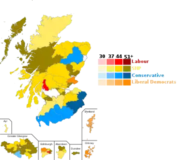 The election concluded with the SNP winning a fourth consecutive term in government, winning 64 seats and an increase of one. The SNP gained Edinburgh Central, Ayr, and East Lothian as well as winning the largest share of the popular vote and the largest number of constituency seats in any Scottish Parliament election (62).[5] The Greens won 8 seats, their best result to date at a Scottish Parliament election, while the Conservatives retained second place with 31 seats. Labour had its worst-ever result with 22 seats, and the lowest share of the vote in both Constituency & List votes for either Westminster or Holyrood since 1910. The Lib Dems won 4 seats, their worst showing at a Holyrood election to date.[6]