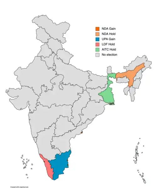 | 27 March; 1 & 6 April 2021 | Assam | Bharatiya Janata Party | Sarbananda Sonowal | Bharatiya Janata Party | Himanta Biswa Sarma | ![]() | ||