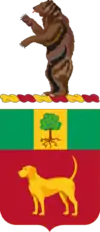 - Shield: Gules, a houn’ dawg statant Or, on a chief Vert a pale of the second (Or) charged with an oak tree eradicated Proper.