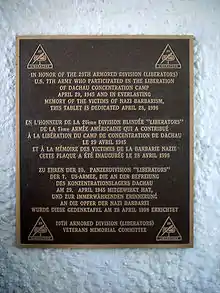 Plaque at Dachau concentration camp honoring the 20th Armored Division and displaying the moniker 'Liberators'.