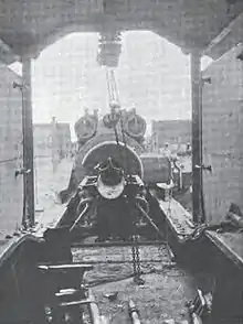 Ammunition on the E. u. B. was moved by means of a shot tray provided with two two-man handles, a yoke above with an eye and wheels so that shells could be moved by hand, rolled or carried by the trolley hoist which runs along the overhead rail. An extensible rail could raised and braced in place to reach shells placed on the ground on in an ammunition car behind the mount. The shot tray could be hooked to the breech to hold the powder and shell in place while they were manually rammed.[4] The gun had to be loaded at zero elevation and thus had to be re-aimed after every shot. The "Peter Adalbert" fired several different shells with weights between 113.5 and 115 kilograms (250 and 254 lb). It used the German naval system of ammunition, where the base charge was held in a metallic cartridge case and supplemented by another charge in a silk bag which was rammed first.[2]