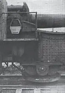 The E. u. B. could fire from any suitable section of track after curved wedges were bolted to the track behind each wheel to absorb any residual recoil after the gun cradle recoiled backwards. It also had a pintle built into the underside of the front of the mount. Two large rollers were fitted to the underside of the mount at the rear. Seven cars could carry a portable metal firing platform (Bettungslafette) that had a central pivot mount and an outer rail. It was assembled with the aid of a derrick or crane, which took between three and five days, and railroad tracks were laid slightly past the firing platform to accommodate the front bogies of the gun. The gun was moved over the firing platform and then lowered into position after the central section of rail was removed. After the gun's pintle was bolted to the firing platform's pivot mount, the entire carriage was jacked up so that the trucks and their sections of rail could be removed. The carriage was then lowered so that the rear rollers rested on the outer track. Concrete versions were also used. It could have up to 360° of traverse. The E. u. B. retained 2° 15' of on-mount traverse for fine aiming adjustments.[3]