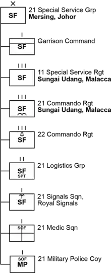 The 21st Special Service Group (Abbr.: 21 SSG, Malay: 21 Gerup Gerak Khas) is a command for Malaysian Army special forces, the Gerak Khas. The 21 SSG and 10th Parachute Brigade are elite fighting formations of the Malaysian Army. Both units are independent units[note 1] under the Malaysian Army and report directly to the Chief of Army. The headquarters of the 21 SSG are at Sri Iskandar Camp in Mersing, Johor.