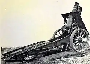 The mle 1915/1916 was considered a successful design until the later stages of the First World War when battlefield mobility was restored and its slow towing speed limited its usefulness. With the armistice, the French army had 272 mle 1915/1916s in its inventory. During the inter-war years the mle 1915/1916 was placed in reserve and Belgium bought eight.[4] At the beginning of Second World War, the French army deployed 376 mle 1915/16s of the 462 still available.[5] When the French surrender in 1940, the Germans used surviving pieces under the designation 22 cm Mörser 530(b) and 22 cm Mörser 531(f).