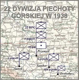 The 22nd Mountain Infantry Division (Polish: 22 Dywizja Piechoty Górskiej, 22 DPG) was a pre-war unit of the Polish Army. It was one of two mountain infantry divisions of Poland to fight against the Invasion of Poland of 1939. Currently its traditions are continued by the 21st Podhale Rifle Brigade. Until 1939 the unit was commanded by Col. Leopold Engel-Ragis and was stationed in and around the towns of Sanok, Przemyśl and Sambor.