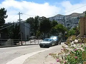 It is one of the steepest streets in the city. In the 250-foot block from Vicksburg to Church Streets in the Noe Valley neighborhood, the city map shows a 79-foot descent along the south side of the street (78+1⁄2 feet (23.9 m) along the north side) for an average grade of just over 31%, about the same as the steepest block of Filbert Street in San Francisco.[1] (Both streets are one-way down; bottom of the 22nd St hill at 37.7549°N 122.4279°W A 1956 view seems to show a two-way street.)