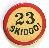 23 skidoo has been described as "perhaps the first truly national fad expression and one of the most popular fad expressions to appear in the U.S," to the extent that "Pennants and arm-bands at shore resorts, parks, and county fairs bore either [23] or the word 'Skiddoo'."[1]