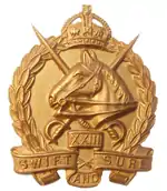Following the war the Australian Light Horse was again reorganised in 1921 and the 23rd formed part of the 6th Cavalry Brigade of the 2nd Cavalry Division. This brigade also contained the 3rd and 9th Light Horse Regiments as well as supporting troops. During the 1920s the Australian Light Horse converted from their pre-war mounted rifles role to that of cavalry modelled along British Army lines.[4]