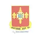 • Symbolism: The shield is red for Artillery. A white cross patée was the badge of the 2d Division, 5th Corps, and a white disk the badge of the 2d Division, 1st Corps, of the Army of the Potomac during the Civil War. The disk has been made blue for contrast, conforming to the heraldic law of not placing metal on metal, and to produce the color combination white and blue, symbolizing the service as Infantry. The sheathed Roman sword, taken from the Spanish War service medal, denotes that the organization served within the continental limits of the United States during the Spanish–American War. The fleurs-de-lis represent the service of the 1st Trench Mortar regiment and the 57th Artillery, Coast Artillery Corps, in France during World War I, which were formed from component parts of the regiment. The number “9” was used by the regiment from the time of its organization in 1859 until 1924. The motto translates to “By Reason Or By Force.”
