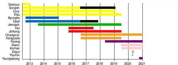 On November 2, Choeun Entertainment made a statement confirming that as of July 6, 2017, Hui had officially left the group, it was also confirmed that Daeil was no longer a member, and that Sungoh's future with the company is to be discussed after he completes his mandatory military service. The remaining six members participated in the JTBC's Survival show Mix Nine.[14]