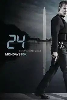 The seventh season of the American drama television series 24, also known as Day 7, premiered in the United States on Fox on January 11, 2009, and concluded on May 18, 2009. The season was originally scheduled to premiere on January 13, 2008, but was delayed due to the 2007–08 Writers Guild of America strike.[1] On November 23, 2008, Fox aired 24: Redemption, a two-hour TV movie set between seasons.[2] Unlike all of the other seasons, this season's DVD set was released one day after the season finale. The season's storyline begins and ends at 8:00 a.m.