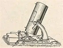 The LadungsWerfer consisted of a rectangular wooden base 1.15 m (3 ft 9 in) long by 59 cm (1 ft 11 in) wide with sheet metal reinforcement along its edges with four handles at the corners for carrying by its crew. There was a cast-iron swivel, attached to the base that was screwed into the base of the barrel and locked in place with a handle. At the front of the swivel, there was a crescent-shaped geared barrel support that attached to a crank on the side of the barrel to adjust elevation that also had a locking lever.[8] Next to the elevation gear, there was a slot that held an inclinometer sight to aim the mortar. There was also a crescent-shaped rail along the front of the base that could be adjusted for the traverse. The large smoothbore barrel was 24.5 cm (9.6 in) in diameter but the German designation rounded down to the nearest centimeter. The advantage of the LadungsWerfer was that they were cheaper to build and easier to transport than the 25 cm schwerer Minenwerfer but they were shorter ranged.[1]