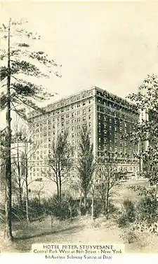 - The post card reads, "The PETER STUYVESANT, an outstanding residential hotel of the upper West Side, commands a beautiful vista of Central Part at 86th Street. The hotel has large single rooms and suites designed for occupancy of those who demand space and comfort. It has an excellent a la carte dining room, where choice wines and liquors are served, and a most attractive Sidewalk Cafe."