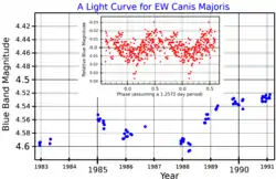 ![]() Blue band light curves for EW Canis Majoris. The main plot shows the long term variability, and the inset plot shows the short term variability. Adapted from Mennickent et al. (1994) and Balona & Rozowsky (1991).[1][2] | |