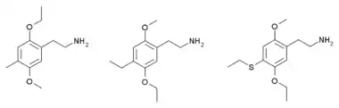 Many tweetio derivatives of various 2C drugs have been synthesized and tested, including the 2-ethoxy homologues 2CD-2EtO, 2CB-2EtO, 2CI-2EtO, 2CT-2EtO, 2CT2-2EtO, 2CT4-2EtO and 2CT7-2EtO, the 5-ethoxy homologues 2CD-5EtO, 2CE-5EtO, 2CB-5EtO, 2CT-5EtO and 2CT2-5EtO, and the 2,5-diethoxy homologues 2CD-diEtO, 2CB-diEtO and 2CT2-diEtO.[1] In general, the 2-ethoxy homologues were all several times less potent and somewhat shorter acting than the parent compounds, while the 2,5-diethoxy homologues were far less potent and qualitatively milder even at high doses.[2] The 5-ethoxy homologues however were of a similar potency to the parent compounds and much longer-lasting, with both 2CE-5EtO and 2CT2-5EtO lasting 24 hours or more.