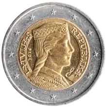 | The Latvian maiden, which symbolises the freedom of the Republic of Latvia, with "Latvijas Republika" written on either side. | 2014 onward | |