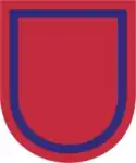 A red shield-shaped embroidered item with a semi-circular base 2 1/4 inches (5.72 cm) in height and 1 7/8 inches (4.76 cm) in width, edged with a 1/8 inch (.32 cm) blue inner border and a 1/8 inch (.32 cm) red outer border. The beret flash was approved on 27 April 2004. It was re-designated for the 2nd Battalion, 377th Field Artillery Regiment on 9 June 2005.[5]