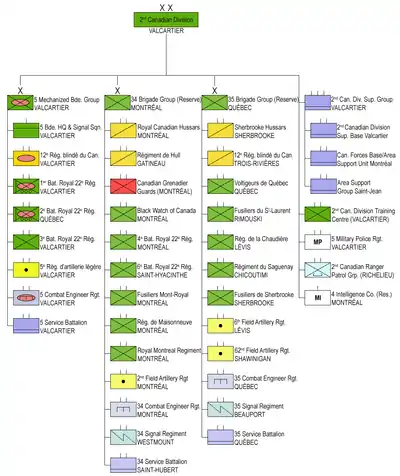 The 2nd Canadian Division (2 Cdn Div) is a formation of the Canadian Army in the province of Quebec, Canada. The present command was created 2013 when Land Force Quebec Area was re-designated. The main unit housed in this division is the Royal 22nd Regiment based at CFB Valcartier near Quebec City, which is the biggest regiment in the Canadian Army.