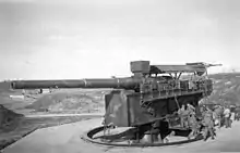 By the end of World War I, six guns in BSG mounts equipped Battery Friedrich August on the island of Wangerooge. Three of these were transferred to Helgoland after 1935 when Hitler renounced the Treaty of Versailles which had demilitarized the island. By 1938, they equipped Battery von Schröder and were manned by troops of the Second Naval Artillery Battalion (II. Marine-Artillerie-Abteilung), later 122nd Naval Artillery Battalion (122. Marine-Artillerie-Abteilung).[14] After the French were defeated in 1940 all three guns were transferred to Le Trésorerie, near Boulogne-sur-Mer, France where they assumed their former name of Battery Friedrich August.[15] These guns were initially in open barbettes with 360° traverse, but these were later rebuilt into concrete casemates with overhead cover.[16] that could elevate to 50 degrees and train 220 degrees in either direction.