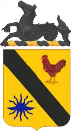 The 315th's distinctive unit insignia was approved on 21 November 1924 and its coat of arms was approved on 26 November. Both were rescinded on 2 March 1959. The distinctive unit insignia included a 1 1/8 in (2.86 cm) gold colored metal and enamel device, which consisted of a golden shield with a black seahorse resting on a scroll with the regimental motto, "See Only Victory", in gold letters. The colors were those of the 64th Cavalry Division, the seahorses represented the seafaring heritage of New England, where it was based, and the motto was given to the regiment by its first Regular Army instructor, Colonel Francis Marshall. The regimental coat of arms included a golden shield divided by a black stripe with a red rooster in the upper right and a winged thunderbolt in the lower left. The black seahorse was the regiment's crest, placed above the shield. The rooster represented the Rhode Islands units and the winged thunderbolt represented Connecticut, alluding to the winged thunderbolt on the flag of Revolutionary War unit Tallmadge's Dragoons.[4]