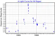 31 Pegasi is a single[9] star in the northern constellation of Pegasus. It is visible to the naked eye as a dim, blue-white hued point of light with a baseline apparent visual magnitude of 4.99.[2] It is located approximately 1,600 light years away from the Sun based on parallax,[1] but is drifting closer with a radial velocity of −5.3 km/s.[4]