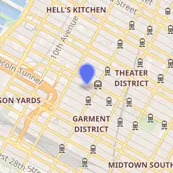 330 West 42nd Street is on the south side of 42nd Street, between Eighth and Ninth Avenues, in the Hell's Kitchen neighborhood of Manhattan in New York City.[3][4] The land lot has an area of 27,975 square feet (2,599.0 m2) and a frontage of 130 feet (40 m) on 42nd Street, extending 197.5 feet (60.2 m) deep.[3] It is on the same city block as The Orion to the west and part of the Port Authority Bus Terminal to the east; the building is also across from Holy Cross Church in the north and the remainder of the bus terminal to the south.[3] The New York City Subway's 42nd Street/Port Authority Bus Terminal station (A, C, and E trains) and Eleven Times Square are on Eighth Avenue, less than one block east.[5]