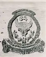 The division takes its name from the shoulder sleeve insignia designed for a 1917 training camp contest by American regionalist artist Marvin Cone, who was then a soldier enlisted in the unit.[9] Cone's design evoked the desert training grounds of Camp Cody, New Mexico, by superimposing a red steer skull over a black Mexican water jug called an "olla." In World War I, the unit was called the "Sandstorm Division." German troops in World War II, however, called the U.S. division's soldiers "Red Devils" and "Red Bulls," the division later officially adopted the divisional nickname Red Bulls.[10]