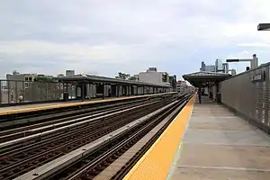 This elevated station has three tracks and two side platforms. The center track is not used in revenue service, but it had been used regularly as recently as 2002.[18]