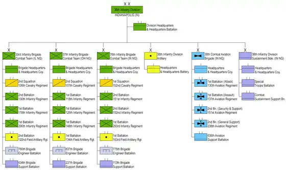 The 38th Infantry Division ("Cyclone"[1]) is one of the eighteen divisions of the United States Army, and one of eight National Guard divisions. It is headquartered in Indianapolis, Indiana, and contains Army National Guard units from Indiana, Ohio, Kentucky, Delaware, Michigan, Tennessee and Other States.[3]