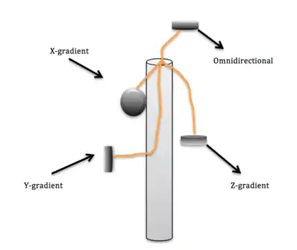 • Contains three orthogonally installed acoustic particle velocity gradient microphones (shown as X, Y and Z array) and one omnidirectional acoustic microphone (O).
