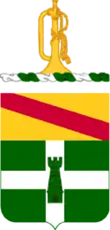 The Regiment's original green facings on the uniform is shown by the color of the shield. The unit's first engagement was the capture of Vera Cruz, and it continued with especially distinguished service throughout the campaign of 1847 to the capture of Mexico City. Upon entering the city, it hoisted the Stars and Stripes over the national palace and displayed the regimental standard from the palace balcony, which drew from General Scott the statement, "Brave Rifles! Veterans! You have been baptized in fire and blood and have come out steel." The campaign is shown by the cross for Vera Cruz and the tower in green (the Mexican color) for fortified Mexico City, the first and last engagements thereof. The chief, taken from the arms of Lorraine, commemorates the regiment's World War I service.[45]