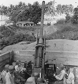 3rd Defense Battalion embarked upon amphibious shipping at Guadalcanal on 26 October 1943. The battalion was spread between USS Alchiba, USS Alhena, USS Libra, USS Titania and USS George Clymer. On 1 November 1943 the 90 mm AA Batteries and Special Weapons Group of the 3rd Defense Battalion landed at Cape Torokina at Empress Augusta Bay under the command of lieutenant colonel Edward H. Forney right behind the first waves of assault troops. On 7 November, the Japanese successfully landed four destroyer-loads of men just beyond the eastern limit of the American beachhead. 3rd Defense Battalion was part of the Marine contingent that annihilated this force the next day in the Battle of Koromokina Lagoon.[11] On 28–29 November, in an effort to block reinforcements from the Japanese 23rd Infantry Regiment, the 1st Marine Parachute Battalion carried out a raid on Koiari, about 9.3 miles (15 km) from Torokina. After landing unopposed, the Japanese counterattacked heavily and the Marines, facing being overrun, had to be rescued by landing craft, which took three attempts to get ashore. Protective fires from the 155mm guns of the 3rd Defense Battalion helped keep the Marines from being overrun until they could be withdrawn.[12] 3rd Defense Battalion remained on Bougainville until 21 June 1944 when it was finally withdrawn. It was the last unit that had landed the previous November that still remained on the island. Prior to their move, the battalion was re-designated as the 3rd Antiaircraft Artillery Battalion attached to the III Amphibious Corps. Upon their return to Guadalcanal the battalion set out building a camp on the beach near the village of Tetere. The battalion was still at this location on 26 November 1944 received orders directing he immediate deactivation of the battalion. They were officially deactivated on 15 December 1944.