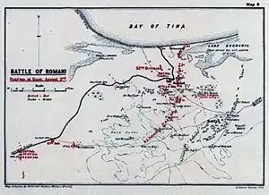 4 August artillery fire was heard as the Battle of Romani began, and 127 Bde was rushed by railway up to Pelusium where 1/6th Manchesters were preparing defences. The newly arrived battalions passed through 1/6th Manchesters to support the Anzac Mounted Division, which was heavily engaged. The Manchesters marched rapidly through the desert in the hottest part of the day, 1/7th Bn leading on the left, but the battle was already over when they arrived. Camels carrying vital water and supplies only reached the front line troops at the end of the day. During 5 and 6 August the brigade pursued the defeated Turkish force, suffering badly from extreme heat and lack of water, with many men falling out through exhaustion, until it reached Qatiya.[17][35]