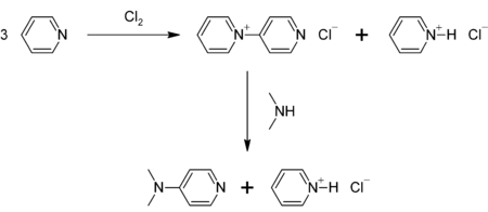 DMAP can be prepared in a two-step procedure from pyridine, which is first oxidized to 4-pyridylpyridinium cation. This cation then reacts with dimethylamine:[7]