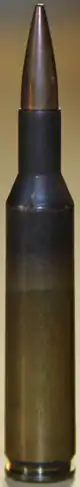 The cases of these experimental 5 mm rounds were reformed 5.56 mm NATO cases, although the shape of the bullet was a scaled-down version of an earlier experimental round, measuring 6.23×43 mm.[4] A round measuring 5×44 mm at the neck, made in 1970, was effectively the prototype of the round eventually adopted, although under the name 4.85×49 mm.[3][4] The diameter of the round did not change. It was decided to rename it "4.85 mm", to match the diameter of the barrel's lands,[3] rather than the diameter of the bullet neck.