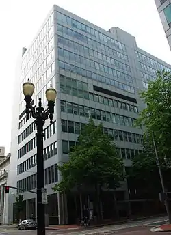 First National Bank of Oregon announced it would build a new headquarters building in 1957,[1] with the contract to build the structure going to Hoffman Construction Company.[2] The planned $3.5 million, five-story building was designed by Stanton, Boles, Maguire & Church and was to have 100,000 square feet (9,300 m2) of space.[2] The building was to be on the site of the Century Theater and Lafayette Building, and would also require the demolition of part of the bank's existing headquarters.[1][2]