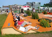 During the summer, various activities took place on the site.[35] Quebec historian Bernard Arcand organized 34 lectures on the history of Quebec City.[35] Various artists, including Ima, Marco Calliari, Les Zapartistes, We Are Wolves, Jérôme Minière, Tokyo Police Club, Maurane, and Philippe Lafontaine, performed at the "Grande Place", a temporary outdoor stage erected near Bassin Louise.[35][37] There were also two thousand performances by various street artists and daily children's activities organized by La Boîte à Science, a science centre,[38] and Rêves en Stock, Quebec City theatre.[35] First Nations members also organized cultural activities.[35]