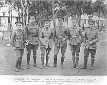 With an authorised strength of 1,023 men,[6] the 40th Battalion arrived at the front in December, but its first major battle did not come until June 1917 when it fought in the Battle of Messines. The introduction to war proved costly, with the battalion losing over 350 men killed or wounded.[3] Its next major effort came four months later during the Battle of Broodseinde Ridge on 4 October, where one of the battalion's soldiers, Sergeant Lewis McGee of 'B' Company, performed the deeds for which he was awarded the Victoria Cross. As McGee's platoon advanced, it began taking heavy machine gun fire from a German pillbox. Alone, McGee ran over open ground and, with only his service revolver, he killed the machine-gun's crew and captured the remainder of the pillbox's garrison.[4] Later, he returned to his platoon and gathered a group of men to take another machine gun post;[7] the battalion was subsequently able to take its objective.[8] A week later, the battalion took part in a follow-up attack as the Battle of Passchendaele continued. Advancing across muddy ground, the battalion came under machine gun fire from their front and flanks,[9] and the attack ultimately failed due to the weather.[3] Combined with their losses at Broodseinde Ridge, the 40th Battalion suffered 248 casualties during the fighting around Passchendaele, including McGee who was killed in action trying to silence a machine-gun post during the failed follow-up attack.[10]