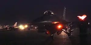 ![]() F-16 Fighting Falcons from the 410th Air Expeditionary Wing taxi in after a long reconnaissance mission at an airbase in Jordan | |