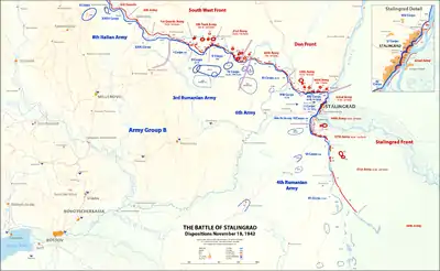 By September 1942 the division took up defensive positions on the high banks of the Don, protecting the long left flank of the 6th Army in Stalingrad.[29] On 19 November the Soviet Army opened Operation Uranus against Romanian forces to the north. Manoilin, one of the supply bases for the division had already been attacked by Soviet armour units.[30] An attack against this sector had not been totally unexpected by the German command, and the previous day the 6th Army authorised the 44 Infantry to release the 132 Infantry Regiment from its defensive positions along the bluffs overlooking the Don, for commitment elsewhere. The regiment was already short of men, so it dissolved one battalion (III/132) and distributed its men to the other two.[31]