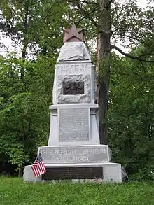 In early August, Banks' corps, now part of Maj. Gen. John Pope's Army of Virginia, was stationed at Culpeper, Virginia. With reports of Jackson's Confederate troops marching in their direction, the 46th and the rest of their brigade under Brig. Gen. Samuel W. Crawford were ordered to attack them near a promontory named Cedar Mountain. Advancing across a wheat field, Crawford's brigade smashed into the left of Jackson's line and collapsed elements of two brigades there, including the vaunted Stonewall Brigade. During the confusion of battle, the 46th split in two directions, with the right half engaging the right flank of the Stonewall Brigade, and the left half tangling with the left end of Brig. Gen. Richard B. Garnett's brigade.[6] The fighting here was close and savage, including hand-to-hand combat. However, with no Union reinforcements immediately sent to sustain this breakthrough, and with pressure from additional Rebel troops sent to shore up and rally this end of the line, Crawford's men were soon outflanked and forced to retreat back across the wheat field.[7]