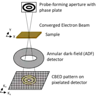This technique MIDI-STEM (matched illumination and detector interferometry-STEM), while being less common, is used with ptychography to create higher contrast phase images. The placement of a phase plate with zones of 0 and π/2 phase shift in the probe forming aperture creates a series of concentric rings in the resulting CBED pattern. The difference in counts between the 0 and π/2 regions allows for direct measurement of local sample phase.[39] The counts in the different regions could be measured via complex standard detector geometries or the use of a pixelated detector in 4D STEM. Pixelated detectors have been shown to utilize this technique with atomic resolution.[40]