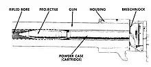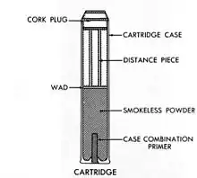 The powder case is a brass or steel alloy cylinder closed at one end. It holds the propelling charge and a case combination primer. The charge is held packed around the primer by a wad, distance piece (not in clearing charge), and plug.[27] When rammed in the chamber with the projectile, the Full and Reduced charge cases are designed to completely fill the volume of the chamber from the breechblock face to the base of the projectile when its rotating band is jammed into the bore's rifling. In other words, the powder case acts a rammer extension for the projectile. There are three types of powder cases: