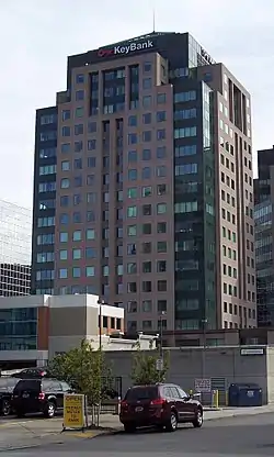 50 Fountain Plaza, formerly the Key Center North Tower, is a high-rise located in Buffalo, New York, USA. It is the eighth tallest building in Buffalo at 275 feet (85 m) and 17 stories tall.[1] The building has a twin tower next door, 40 Fountain Plaza (formerly Key Center South Tower) which is four stories shorter and connected by a two-story glass atrium encompassing 18,800 square feet of retail space. Once known as the Key Center, the complex is now simply known as Fountain Plaza after KeyBank moved out.[2][3] Both buildings have distinctive pyramid tops that are trimmed with bright green neon lighting which is illuminated at night. In the front of the two towers is a large fountain in the summer. In the winter, it serves as an outdoor ice rink that is free to the public.[4]