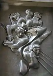 Isamu Noguchi's 10-short-ton (8.9-long-ton) stainless steel panel, News, is located above the building's entrance. His work, which depicts the various forms of communications used by journalists in the 1930s, honors the different occupations in the news industry.[19][20] It is one of Noguchi's last abstract works as well as the only stainless steel work he ever commissioned.[20]