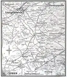 The infantry of the division continued its dispersed existence to the extent that some battalions were split into companies and attached to different battalions of other divisions in the line, even the division history admits difficulty in following them.[23] The brigades of the division were used to reinforce the regular units in the line, (from North to South) the 149th brigade with the 4th Division around Verlorenhoek, the 151st with the 28th Division, West of Bellewaarde, and the 150th with the Cavalry Corps[lower-alpha 2] near Bellewaarde lake and the Menin Road.[25]